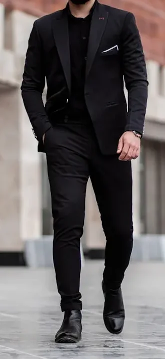 全身ブラックですが、ポケットに白ハンカチを入れることで黒の重い印象を軽減しています。