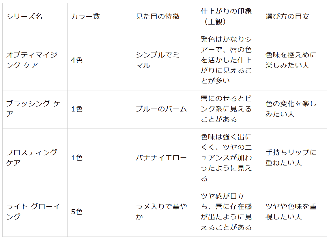 自然なツヤ感と控えめな色づきが特徴のシリーズ。